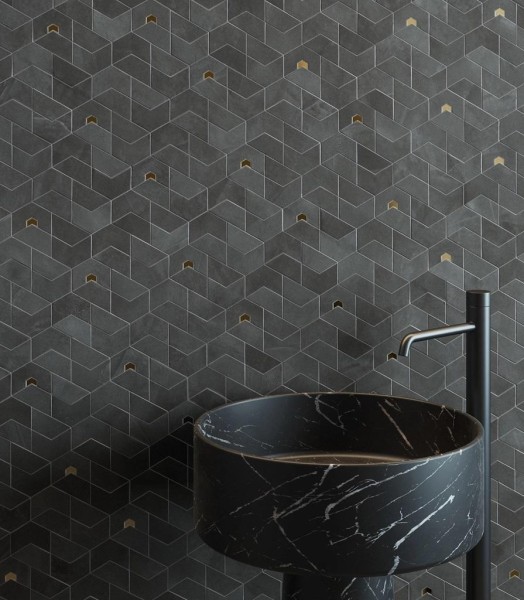 5 актуальных цветов фоновой плитки - Полар, Пьюр, Сильвер, Айрон и Петрол - дополнены керамогранитом, имитирующим натуральные агломераты - Стоун Беж и Стоун Грэй - и листы латуни Брасс Голд и Брасс Дарк, а также мозаикой и декорами.